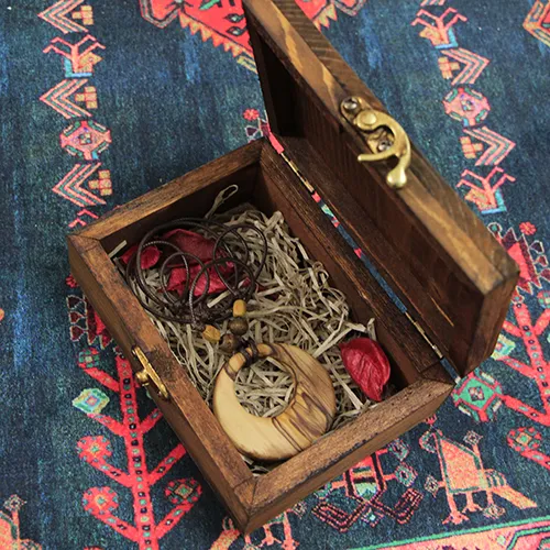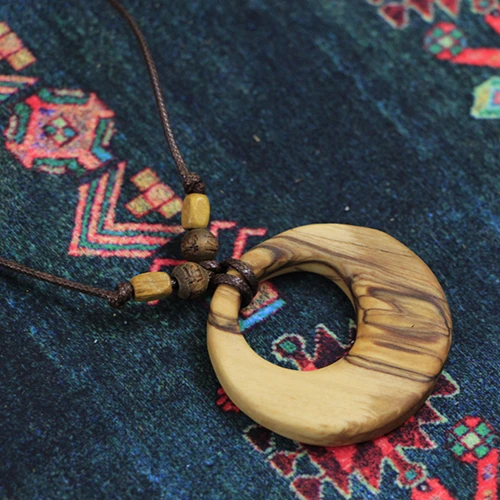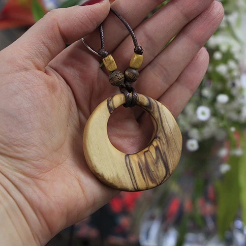 گردنبند چوبی طرح گرد ساخته شده از چوب زیتون و دارای بند چرمی و مهره های چوبی می باشد.